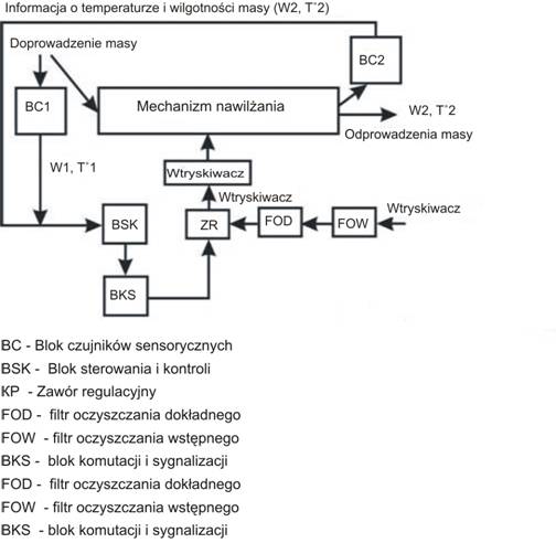Wejściowymi sygnałami systemu są wartości wilgotności, zmierzone pierwszym i drugim blokiem czujników sensorycznych (W1 i W2 odpowiednio) oraz wartość ustawiona (Wust) w celu autoregulacji. W przypadku niewystarczającej grubości warstwy materiału, przechodzącego przez BCzS1 i (lub) BCzS2 system kontynuuje pracę, z tym że odpowiednia wartość wilgotności W1 i (lub) W2 nie jest określana i wpływu na sygnał wyjściowy nie wywiera. Sygnałem wyjściowym jest sygnał sterowania zaworem regulującym. Wartość sygnału wyjściowego jest proporcjonalna ustawionej ilości wody, niezbędnej do utrzymania ustawionej wartości wilgotności masy przy wyjściu z mechanizmu nawilżania. System posiada następujące tryby pracy: „Automat” – podstawowy tryb pracy; „Ręczny” – tryb pomocniczy; „Wstrzymanie” – tryb oczekiwania, w przypadku zatrzymania mechanizmu nawilżania. Zgodnie z powyższym, system posiada trzy stany. Dla sygnalizacji tych stanów w bloku komutacji i sygnalizacji są zainstalowane kontrolne żarówki sygnalizujące włączenie trybów „Ręczny”, „Automat” „Wstrzymanie” oraz sygnalizator dźwiękowy. Zarówno sterowanie sygnalizacją jak i symulacja sytuacji awaryjnych dokonuje się w BKS drogą analizy i przetwarzania sygnałów, wytwarzanych przez MK. Przy włączonym trybie „Ręczny” sterowanie dopływem wody dokonuje operator, który kontroluje wilgotność masy przy wejściu i wyjściu z maszyny nawilżającej na podstawie wskazań miernika wilgotności. Regulacja dopływu wody dokonuje się poprzez zmianę stanu zaworu regulującego przy pomocy klawiatury BSK miernika wilgotności. Do trybu „Wstrzymanie” system przełącza się z trybu „Automat” po odbiorze sygnału zewnętrznego informującego o zatrzymaniu mechanizmu nawilżania. W trybie „Wstrzymanie” pomiarów się nie dokonuje, zawór jest zamknięty, na LCD BSK wyświetla się wiadomość „Wstrzymanie przenośnika”. Po odbiorze sygnału zewnętrznego informującego o zatrzymaniu mechanizmu nawilżania system ponownie rozpoczyna pracę w trybie „Automat”. Informacja o pracy systemu za pośrednictwem kanału łączności RS485 jest przekazywana do oddalonego komputera. Sterowanie dopływem wody, wprowadzanie wartości wilgotności, korygowanie wskazań miernika wilgotności można dokonywać zarówno z komputera oddalonego, tak i przy pomocy klawiatury kontrolera. Na podstawie schematu poglądowego, wyświetlanego na ekranie monitora, operator może kontrolować przebieg procesu nawilżania, przeglądać poprzednie zapisy procesu technologicznego. Dane o wilgotności i temperaturze masy sylikatowej przy wejściu i wyjściu z maszyny nawilżającej, o zużyciu wody, są gromadzone i wyświetlane na monitorze w kształcie trendow. ·